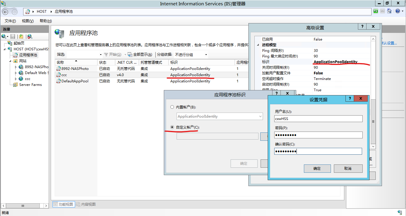 8.上一步说的设置如下,在应用程序池的高级设置中标识项打开选择自定义账户,填入第四步输入的账户和密码,确定即可